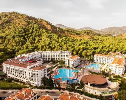 Основен ресторант, а-ла-карт ресторант (интернационална кухня - платен), 6 бара, 3 открити басейна ( 1100 м² и 650 м² )и 1 закрит басейн, аквапарк, магазини, СПА център. За децата: водни пързалки, 2 детски басейна, детска площадка, мини футбол, мини диско, мини клуб,(4-12г.) Безплатни услуги: сауна, турска баня, парна баня, фитнес, аеробика, баскетбол, волейбол, водна гимнастика, тенис на корт, тенис на маса, анимация, WI-FI интернет в лоби. Платени услуги: масаж, център за разкрасяване, пералня, химическо чистене, лекар, джакузи, оборудване за тенис корт, билярд, интернет кафе. Плаж: Собствен плаж в Ичмелер, на 3.5 км. от хотела. Безпатен шатъл до плажа в Ичмелер. Чадъри и шезлонги на басейна – безплатни и на плажа – безплатни. Не се предоставят плажни кърпи.