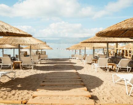 Плаж: собствен, пясъчен на 120 метра от хотела. Шезлонги, чадъри и плажни кърпи - на плажа и басейна безплатно.